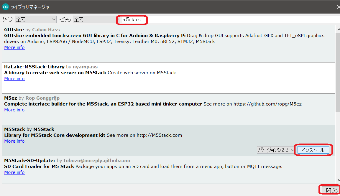 M5StickCの場合は、「M5StickC」と検索し、「M5StickC by M5StickC」をインストールします。